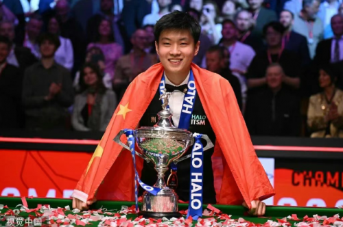 当地时间2025年5月5日,英国谢菲尔德,2025斯诺克世锦赛决赛第四阶段比赛结束,中国选手赵心童总比分18比12战胜马克·威廉姆斯夺得冠军,成为中国首位,也是亚洲首位斯诺克世锦赛冠军,创造了斯诺克运动的历史。Oli Scarff/AFP/摄